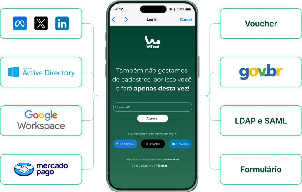 Gerencie quem acessa sua rede com mais de 15 métodos de autenticação, incluindo SSO com 2FA. Compatível com Active Directory, Google Workspace, SAML, Gov.br, OpenRoaming, login social, formulário, voucher e diversos outros.